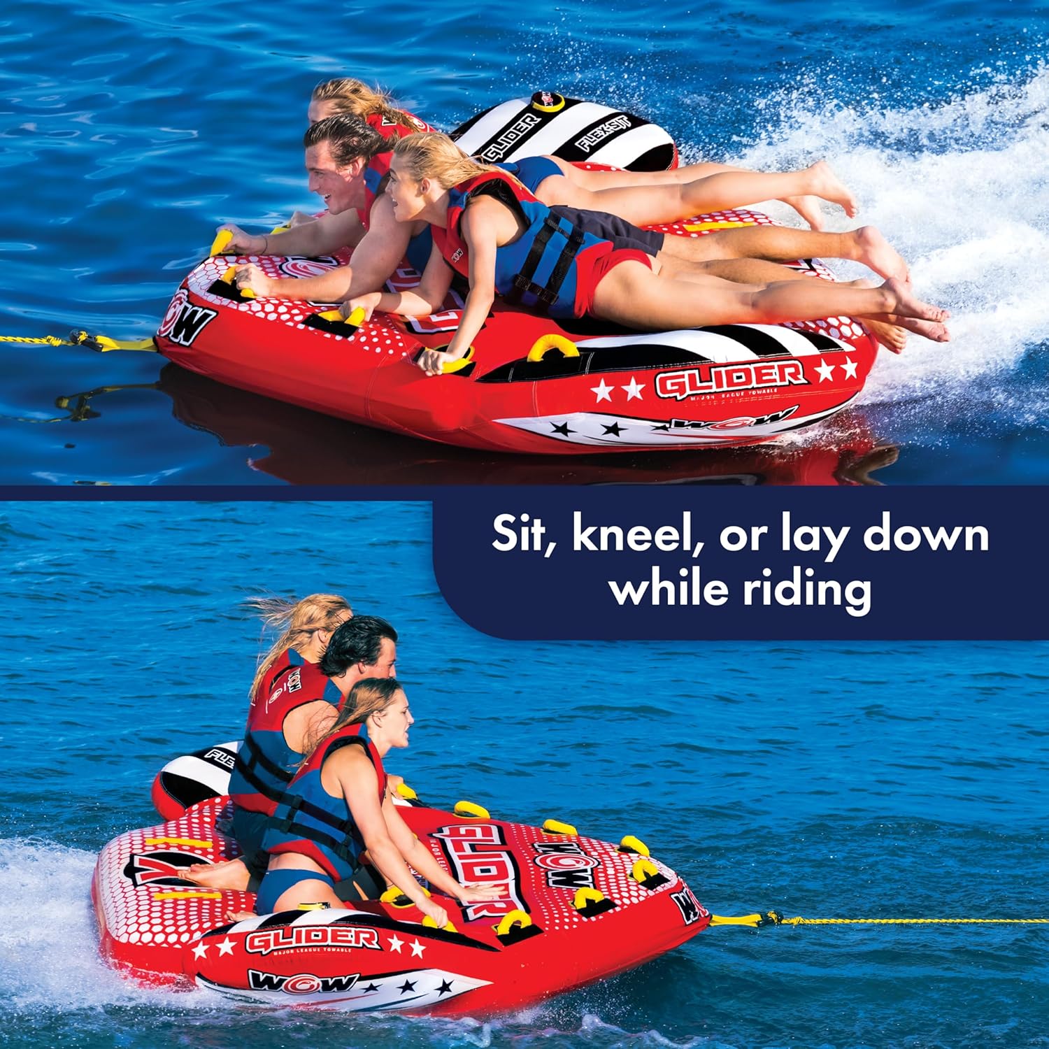 Things can get wild on the water, and that's when the Glider flies in to save the day. Sure, it doesn't get totally airborne (but you could get some serious air on this thing), but we included innovative wings that keep you stable when the water gets choppy. This rad two-seater lets the riders choose from multiple positions: sitting in the cockpit, laying on the deck, or kneeling on the back edge — with the ability to change their position in seconds, mid-ride. We also threw in plenty of cushy foam handles to help you hold on tight at top speeds. In between rides, the speed valve helps you inflate and deflate the Glider fast.