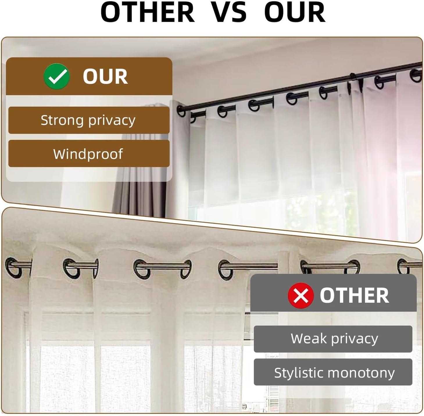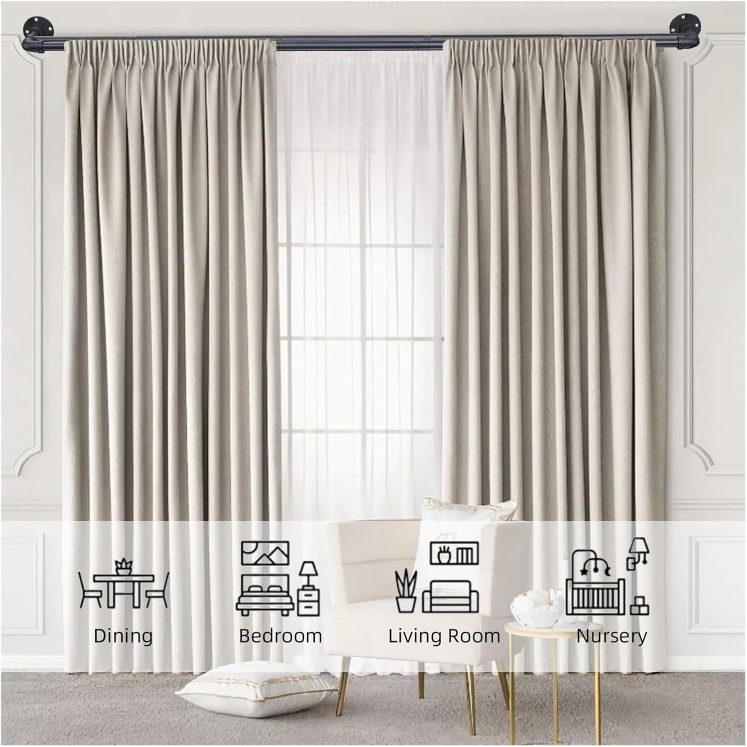 1.Its smooth surface is not easily scratched, and it fits the wall to block light to the maximum extent.2.Suitable for living rooms, bedrooms, studies, kitchens, and even terraces, adding a unique touch to existing home décor.3. The curtain rod set includes all installation accessories, including brackets, screws, wall anchors, and installation instructions, making installation easy for you.