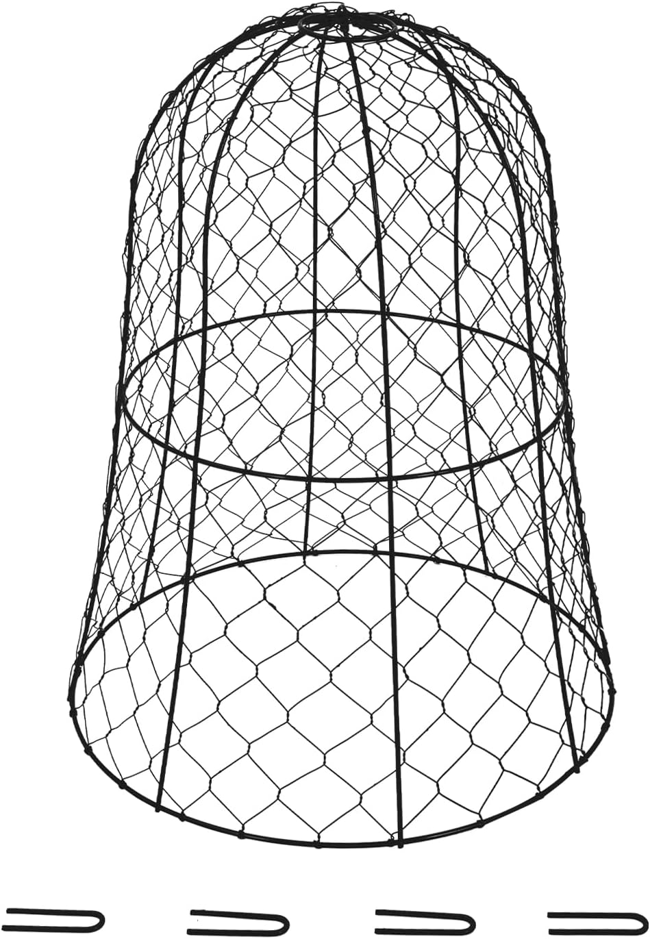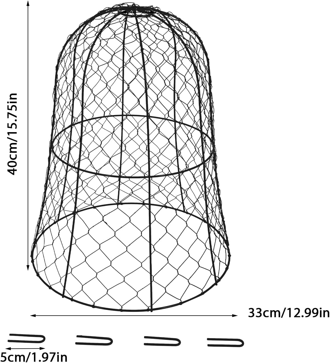 DescriptionA plant protective cover is not only a practical tool but also a beautiful decor for your garden or balcony. Its large space(12.99"H×15.75" D) and fine&sturdy mesh can allow full sunlight to reach your plants. With these 5/10/20 pieces, you can give your plants a better environment.DetailsConvenient Hanging Loop: The round hanging loop at the top is very convenient for you to lift and carry.Woven Iron Wires: This design ensures a comfortable and secure touch while protecting your skin from scratches. ApplicationIt is suitable for both indoor and outdoor use. It is suitable for gardens, parks, yards, balconies, farms, and other indoor and outdoor places to protect your plants, fruits, etc.SpecificationColor: Black/ GreenShape: ConeMaterial: IronStyle: ModernPattern: Fishnet PatternNumber of Pieces: 5/10/20Processes: Powder Coating, Hand Woven, WeldedLower Diameter: 33cm/ 12.99inTop Hanging Loop Diameter: 5cm/ 1.97 inProduct Height: 40cm/ 15.75 inU-shaped Ground Nail Length: 5cm/ 1.97inPackage Size: 56*35*33cm/ 22.04*13.78*12.99 in、36*76*34cm/ 14.2*30*13.4 in、65*35*76cm/ 25.6*13.78*30 inNet Weight: 1.9kg/ 4.2 lbs、3.8kg/ 8.4 lbs、11.5kg/ 25.35 lbsGross Weight: 2.8kg/ 6.2 lbs、4.9kg/ 10.8 lbs、12kg/ 26.46 lbsPackage Included5/10/20* Plant Protective Covers 20/40/80* U-shaped Ground NailsNotesPlease make sure it's the right size you want before purchasing. Please allow the slight color difference caused by the shooting light and 1-3cm error due to manual measurement, and make sure you do not mind before ordering.