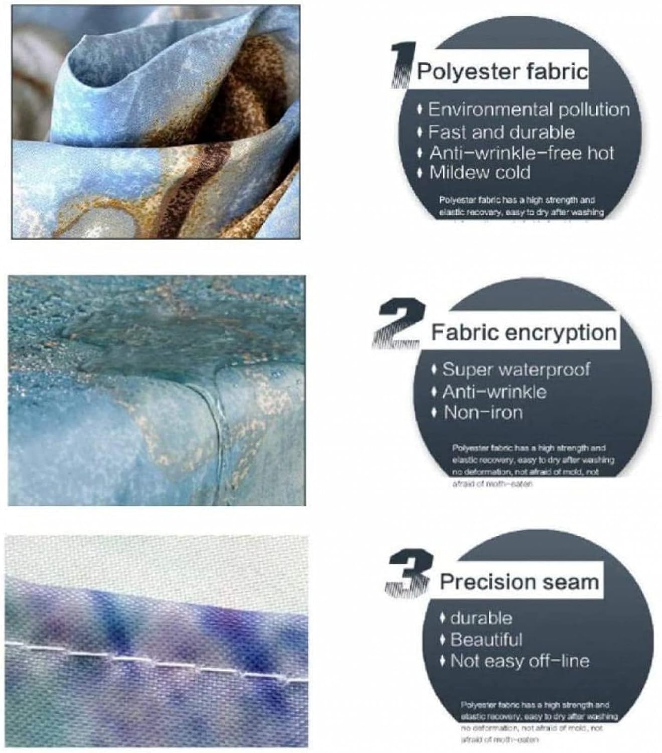 high quality shower curtain sets.Our 4 piece shower curtain sets enough to keep your bathroom cleaning,Christmas decorations Let you add pleasure in the bath.This kind of high quality shower curtain match.the excellent you.WHY CHOOSE US:Waterproof material: 100% polyester, has a good waterproof effect, super soft and skin-friendly, easy to hanging, do not fade.Non-Slip bathroom mat: Bathroom mat is made of high quality flannel, used in the bathroom, it can be very effective and non-slip, helping you to enjoy a pleasant bath time.Advanced technology: Adopt HD digital printing, clear vibrant colorful design will bright up your bathroom!Easy to use: We give 12 hooks for free to our customer, ensure everyone can easy to install this shower curtain.PACKAGE INCLUDED:1 × Shower Curtain12 × Strong Hooks1× Bathroom Mat1 × Toilet Lid Cover1 × U Shape RugWARM GUIDANCE:1. Don’t bleach or tumble dry.2. Machine wash cold or wipe clean with a damp cloth.3.Product sizes that measured by hand lead to the difference between about 1-2 Inch due to everyone’s measurement technique.4.All the patterns are printed by digital equipment , So sometimes the color a litter difference from the objects,pls understand it ,thank u very much .SATISFIED SERVICE: Your 100% satisfaction is our 1 priority.